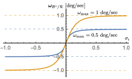 Here as \(\sigma_{i} \rightarrow \infty\) then the function \(f\) smoothly converges to the maximum speed rate \(\pm \omega_{\text{max}}\). For small \(|\pmb\sigma_{\mathcal{B}/\mathcal{R}}|\), this function linearizes to