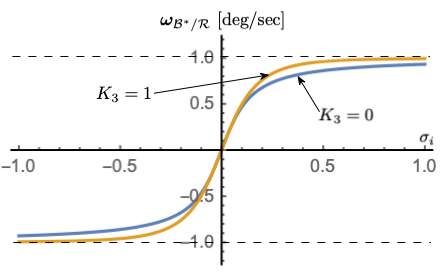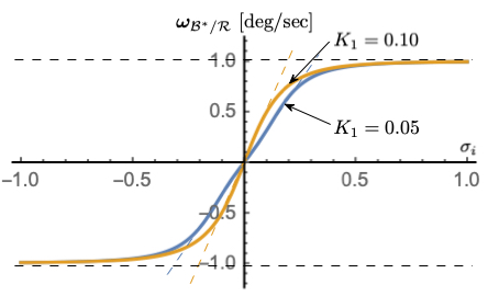 If the MRP shadow set parameters are used to avoid the MRP singularity at 360 deg, then \(|\pmb\sigma_{\mathcal{B}/\mathcal{R}}|\) is upper limited by 1. To control how rapidly the rate commands approach the \(\omega_{\text{max}}\) limit, Eq. (15) is modified to include a cubic term: