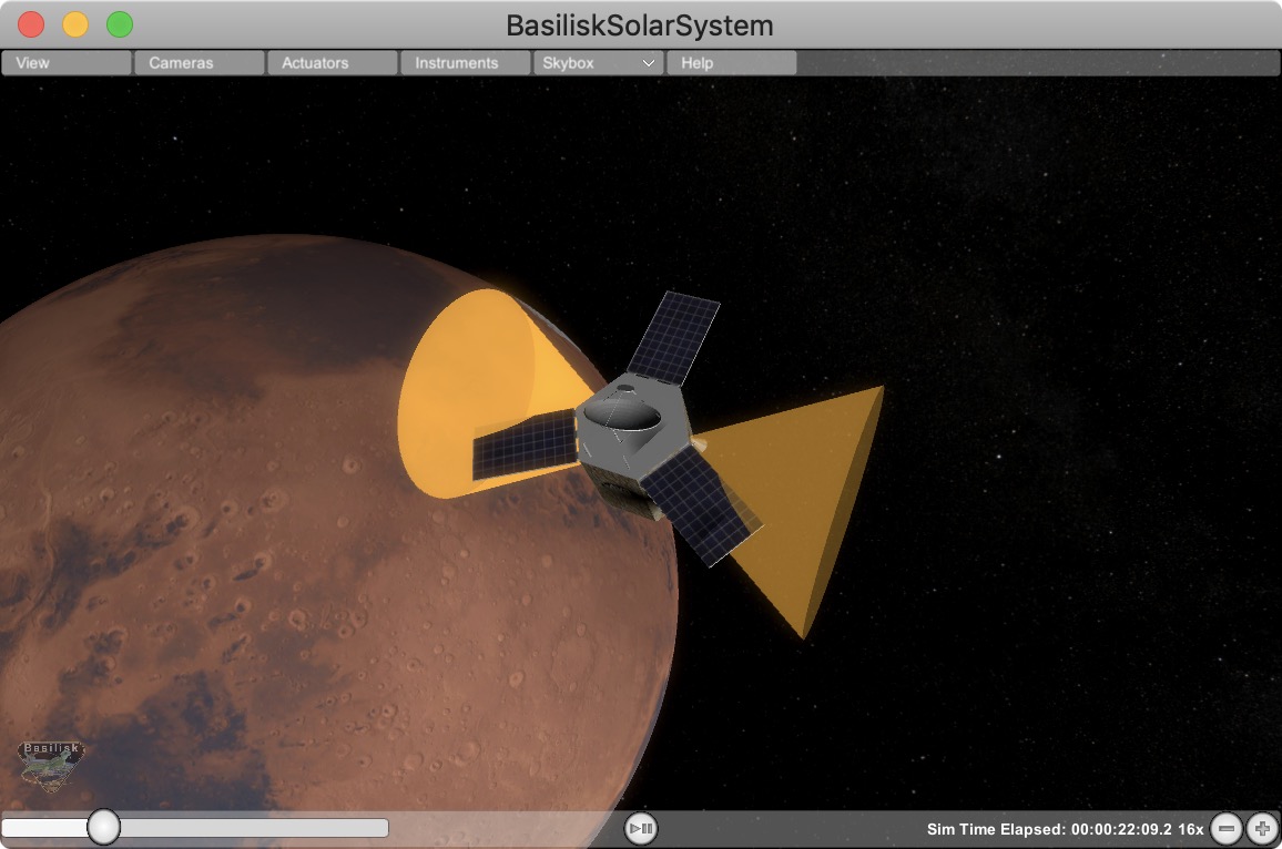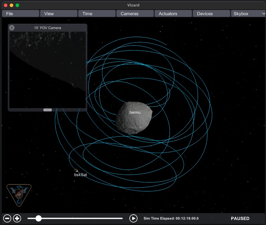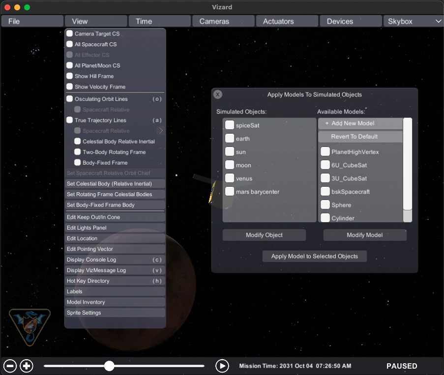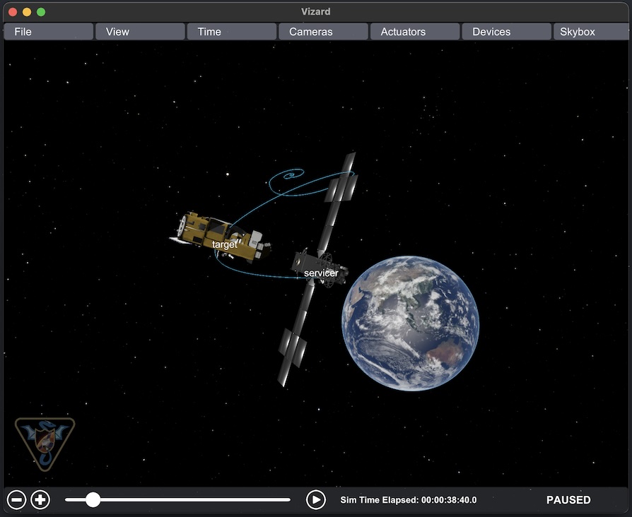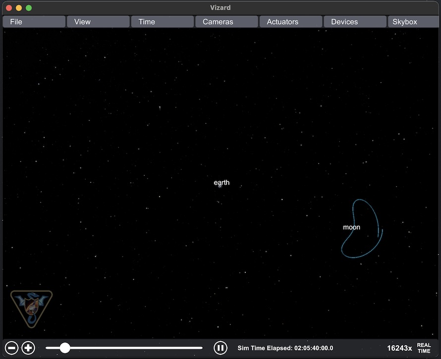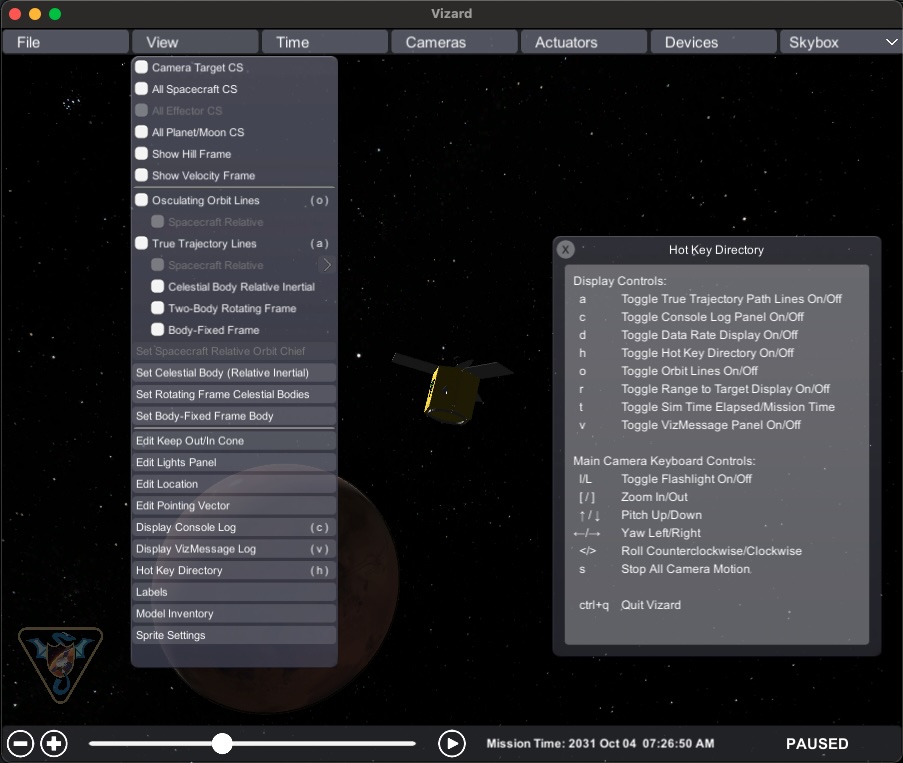 Vizard is able to show the position and orientation of the spacecraft being simulated. If one or more planets are being modeled, then the spacecraft is show relative to the nearest planet.