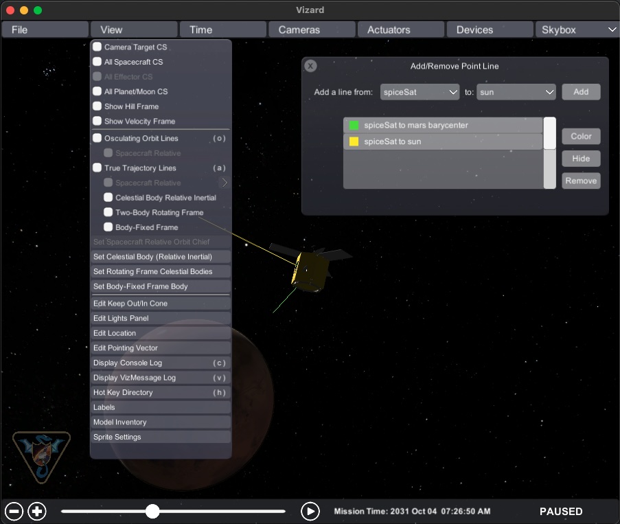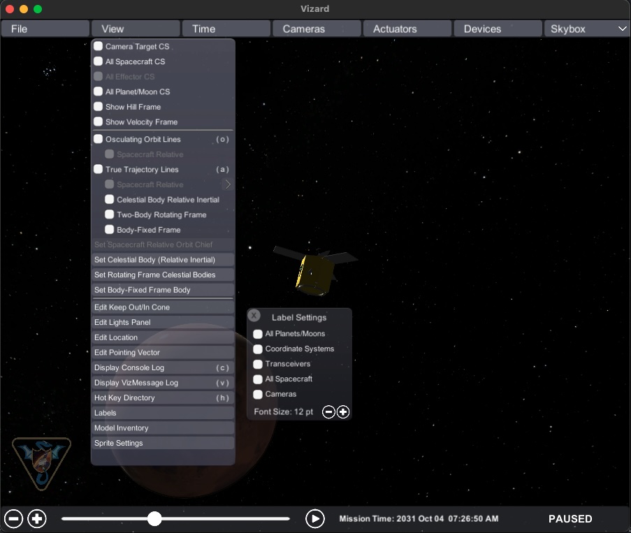 Planet-Centric View Mode: Here a planet-wide view is presented. When rotating the view point this is about with the center of the planet as the center of rotation. The spacecraft trajectory is shown. The spacecraft is drawn at an exaggerated size so it is visible as a 3D object in this view. To return to a spacecraft-centric view mode double click on the spacecraft. If you zoom out far enough then the mode switches to a heliocentric view.