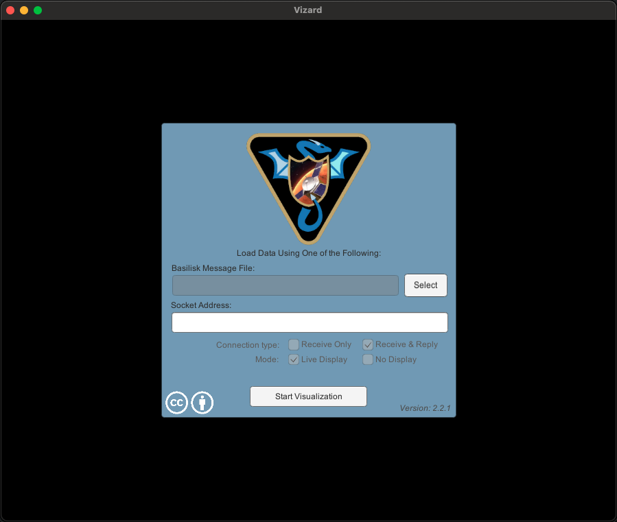 When starting up the Vizard software a panel is presented where the user can select which simulation to visualize. To play back a previously recorded BSK simulation press the Select button and navigate to the binary BSK recording file. After a file has been selected press the Start Visualization button.