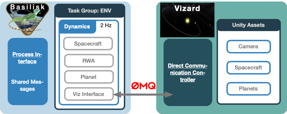 This Basilisk Simulation, which inherits SimulationBaseClass, provides the backbone for all the OpNav simulations provided in basilisk/examples/OpNavScenarios. These simulations spawn the Basilisk Vizard visualization in order to provide images for processing. These images are handled by the vizInterface module found in src/simulation/vizInterface. A figure illustrating the architecture is found here: